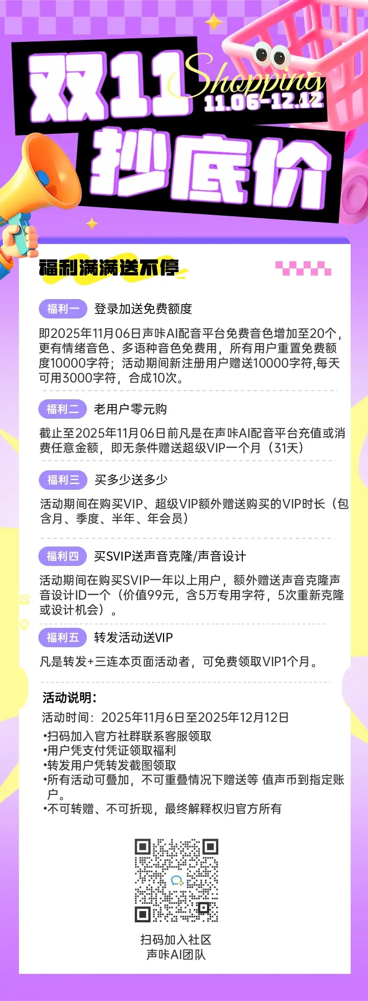 ✨ 感谢大家一直以来的关注与支持~简单介绍下我们,我们是一个小团队,一直努力做着认为对的事情,就是希望通过我们的小小努力能够帮助您在音频创作方面提高效率,节约成本。得到您的关注我们深感荣幸,同时也希望您能一起参与到我们的产品打磨中,双11了,我们备下了小小心意,有需要就捧个场,当然也能“白嫖”下。